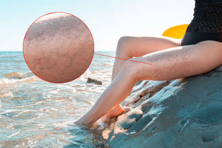 Female legs with varicose veins. In the background, the sea and the coast. Enlarged picture. Concept of vascular diseases of legs, cosmetology and treatment at sea resorts.