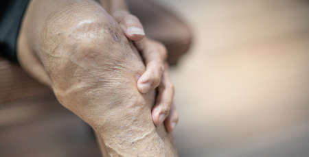 Close up of old man hand holding on the knee with suffering from knee pain. The sick legs of an old man with severely deformed knees affected by arthritis. Joint and bone problems.