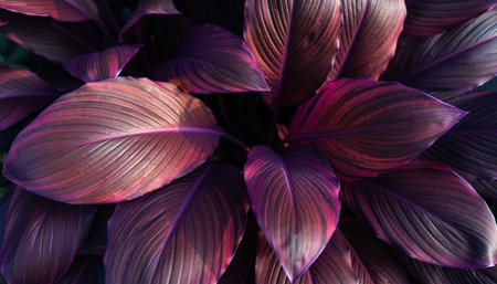 Close-up of deep purple and red tropical plant leaves showcasing intricate veined texture.