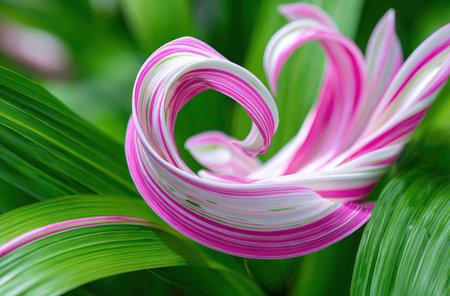 Striking close-up of a flower with curled, pink, and white petals, surrounded by green leaves