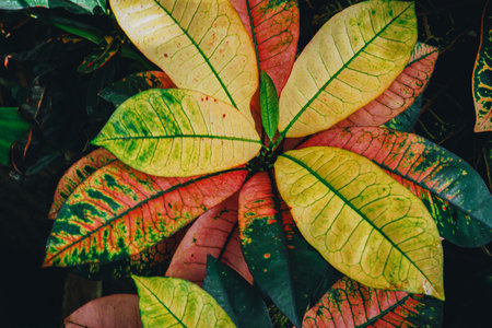 Oakleaf croton background. Green, yellow and red leaves closeup