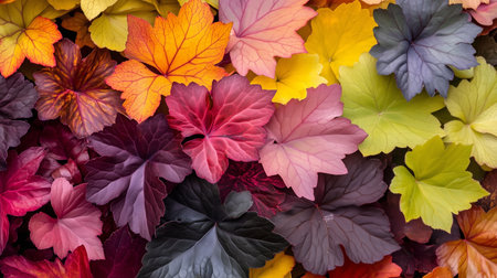 A stunning array of vibrant leaves displayed on a dark background showcases the beauty of nature. Ideal for creative projects, home decor, and artistic inspirations.