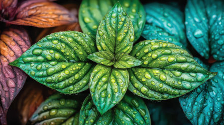 A macro top-down photograph of a plant. The central leaves are green while surrounding leaves are red and blue, all covered in tiny water droplets creating a fresh, natural texture.