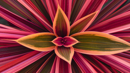 A closeup of radiating leaves in vibrant shades of pink, red and green. The image is a celebration of abstract patterns and natural geometry.