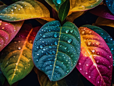 Colorful leaf background image with prominent water droplets. photos of the surface