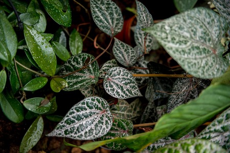 close up view of dossinia leaves and tropical leaves with water drops