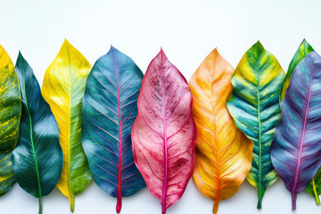 Various vividly colored tropical leaves are artfully aligned on a clean white background, offering a fresh and vibrant feel Useful for botanical or nature-themed projects.