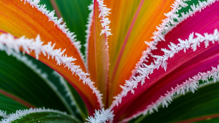 Frost on the leaves of a tropical plant close-up.