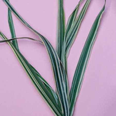 Green Long Leaves On The Pastel Pink Background Top View Trend Colors Flat Lay Minimal Style Copy Space Square