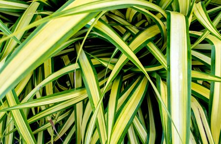 Closeup view of many long light green and yellow thin leaves of fresh lush stems in beautiful wild flower bed on bright natural background outdoor, horizontal picture