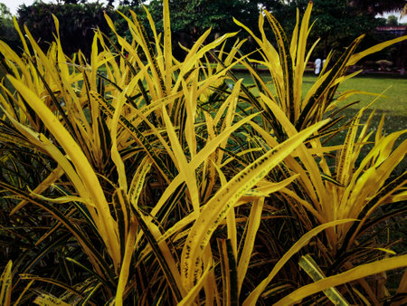 Lush garden croton plants thrive in a tropical garden, showcasing vibrant foliage and adding color to the landscape.