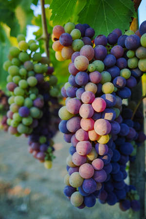 Bunches of red wine grapes hanging on the wine in late afternoon sun