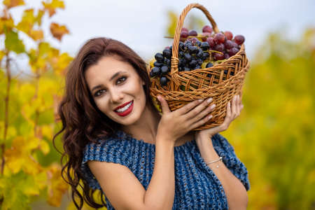 A beautiful woman with a basket of grapes in the vineyard in the autumn.