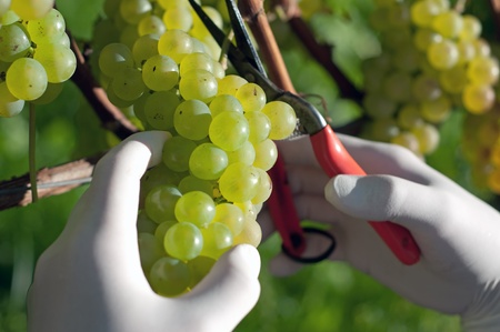 Harvesting white grapes with pruner in the vineyard