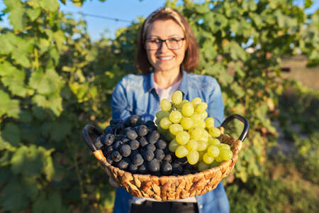 Close-up basket with green and blue grapes in hands of woman, vineyard background. Harvest, autumn, viticulture, gardening, hobbies and leisure concept