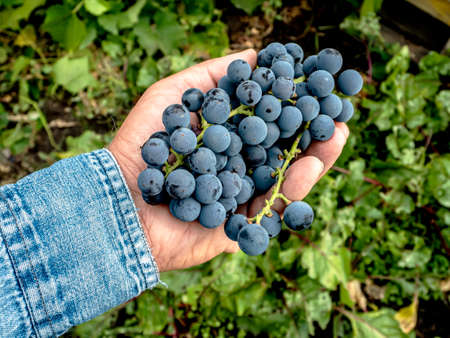 Closeup of a hand with blue ripe grapes. Fresh blue bunches of grapes. The concept of winemaking, wine, vegetable garden, cottage, harvest