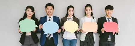 Group of business people while holding up speech bubble icons on gray banner background. wide crop