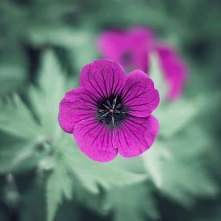 Beautiful fairy dreamy magic crimson scarlet red dahlia flower on faded blurry blue purple background. Dark art moody floral. Toned with filters in retro vintage style.