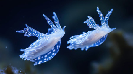 Two delicate blue sea creatures glide through the ocean depths, showcasing their elegant forms and vibrant patterns in a serene underwater environment.
