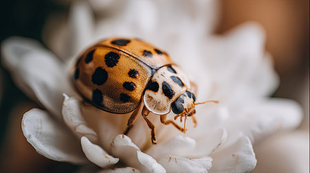 Extreme photograph showcasing a spotted beetle, predominantly orange or yellowish-brown with dark black markings, positioned delicately on the soft, ruffled white petals of a flower, utilizing shallow depth of field to emphasize the subject against a blurred background.