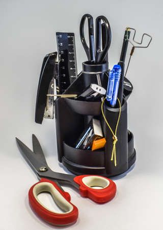 Binder folder, binder clip, staple remover and pencil on a gray table. Office work. Office workplace. Top view at an angle. Selective focus.