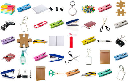 School and office stationery on a white background, pencils, notebooks, Shooting board