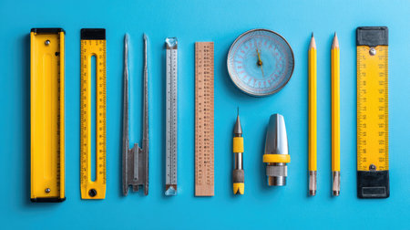 This image showcases a collection of yellow measuring tools arranged on a blue background, ideal for design, construction, and educational projects.