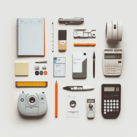 A well-organized workspace featuring a calculator, various stationery items, and graph paper, ideal for planning and enhancing productivity in creative projects.