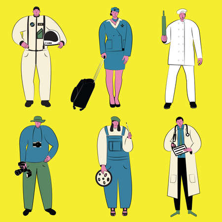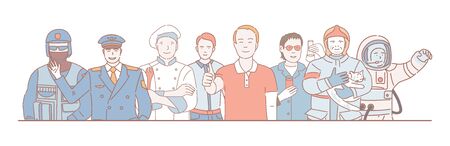 Labor Day vector cartoon outline concept. Police officer, pilot, cook, office worker, chemist, lifeguard, and astronaut.