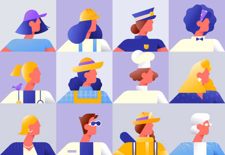 Set of diverse women workers on isolated background. Modern flat gradient character collection for female worker diversity concept. Includes chef, police, firefighter and business woman.
