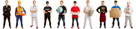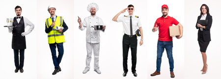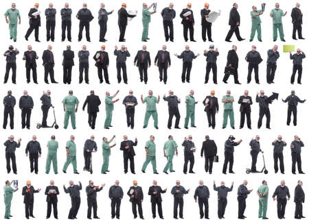 Full length portraits of a group of people of diverse different professions of business, medicine, construction industry on white
