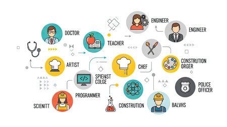 This graphic depicts a diverse group of professions arranged in a circular design. Various icons represent doctors, engineers, teachers, and other career paths, presented in a flat illustration style. The composition uses bright colors and a clean aesthetic. Suitable for illustrations about careers, employment, and education.