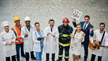 A diverse group of professionals are captured from an overhead perspective, celebrating with confetti in a brightly lit indoor environment. The image showcases a range of individuals, likely representing various occupations, wearing work attire. The style is modern, suggesting potential use for commercial or editorial applications related to careers or teamwork.