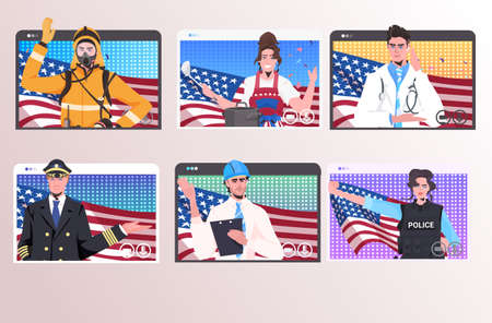 set people of different occupations with USA flags happy labor day celebration self isolation online communication