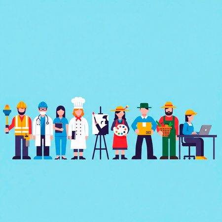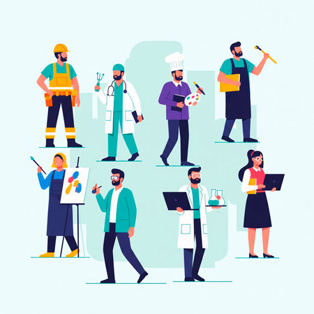 This vibrant illustration employs a bold, abstract style to merge diverse professions into a unified visual narrative. Ideal for educational materials, career guidance resources, or creative projects focusing on workforce diversity. The colorful and dynamic approach makes it engaging for a wide audience. AI-generated illustration.