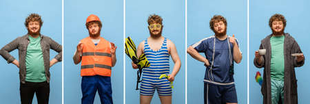 Collage of five photos of young caucasian man in different images isolated on blue studio background