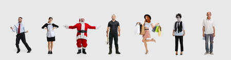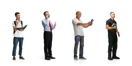 Full-length studio shot of four differet people of several professions isolated on white background. Collage