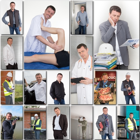 collage of a man in full growth displaying many professions and position
