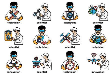 A set of twelve images of people in white lab coats, each with a different profession. The images are arranged in a grid, with each person holding a different object, such as a ruler, a clock