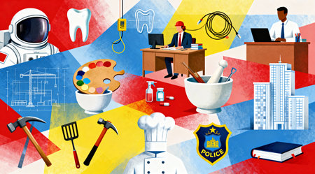 This vibrant illustration features a unique fusion of abstract art and professional themes, executed with bold colors and dynamic shapes. Ideal for educational materials, career guidance resources, or as a creative visual for HR and recruitment agencies. The eclectic style adds a modern touch to any project. AI-generated illustration.