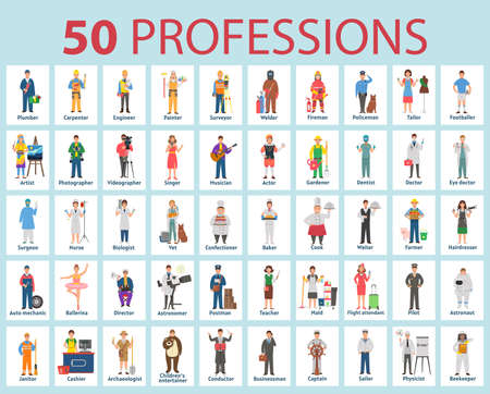 50 professions. Big set of professions in cartoon flat style for children. International Workers' Day, Labor Day