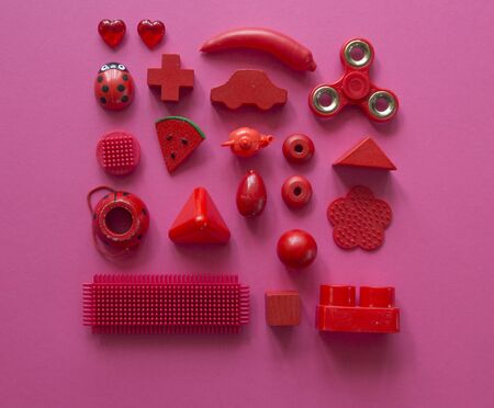 Kids educational developing toys frame on white background. Top view. Flat lay. Copy space for text