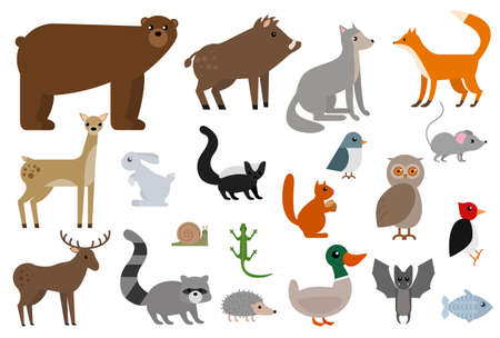 Wild animals elements collection, flat icons set, Colorful symbols pack contains - Fox Wolf Bear Deer Elk Boar Owl Hedgehog Squirrel Mouse Bat Batman. Vector illustration. Flat style design
