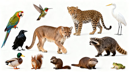 Diverse wildlife animals on white background