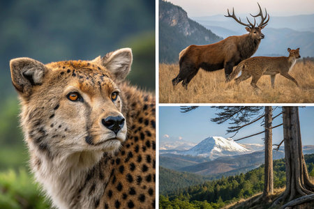 Majestic wildlife collage cheetah, deer, mountains.