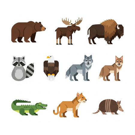 A collection of diverse wildlife featuring a bear, fox, alligator, wolf, bison, and armadillo, showcasing the variety of animals in different ecosystems.