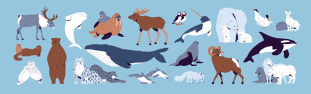 North animals set. Polar bear, owl, arctic fox, tern, snow leopard, sheep, narwhal, orca, antarctic deer. Wild Greenland, Scandinavia, tundra inhabitant. Flat isolated vector illustration on white