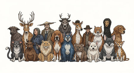 Surreal and imaginative digital depicting animals with human like fashion and expressions The creatures are dressed in various costumes masks and accessories