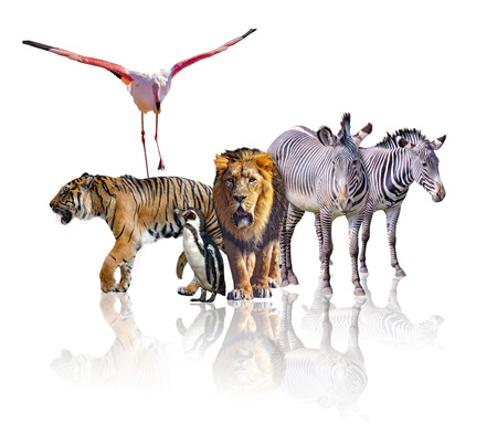 Group of African Safari animals walking together. It is isolated on the white background. It reflects their image. There are zebras, lion, tiger, flamingo and penguin.