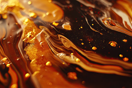 This image features a close-up of a dark, flowing liquid, possibly a food product, on a textured wooden surface. The liquid displays swirling patterns and highlights, suggesting a smooth consistency. The composition and lighting create a sense of depth. Suitable for commercial or editorial applications, the image is versatile.
